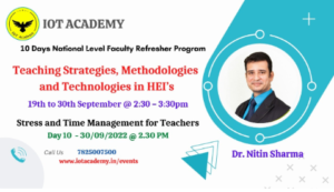 - Invited as a trainer by IOT Academy, Coimbatore, Tamilnadu, India to deliver the session on “Stress and Time Management for Teacher” in 10 Days National Level Faculty Refresher Program (FRP) on Teaching Strategies in HEI’s from 19th to 30th September, 2022.