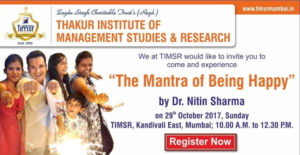 - Successfully Conducted the MDP on “The Mantra of Being Happy” for the corporate people on 29 October 2017, Organized by Thakur Institute of Management Studies and Research, Mumbai. This session inculcates an attitude of continuous achievement, strong social commitment and ethical values in the participants.