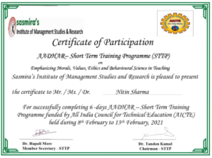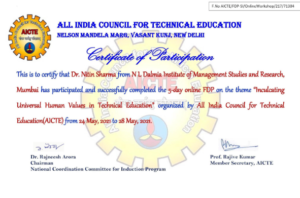 - Successfully completed short-term training program “Emphasizing Moral, Values, Ethics and Behavioral Science in Teaching” organized by Sasmira’s Institute of Management Studies and Research, funded by AICTE, All India Council for Technical Education.