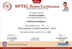 - Appeared and successfully completed the 3 Month Short Term Course on “Emotional Intelligence” from NPTEL, funded by the Ministry of HRD, Govt. of India. Cleared the exam and scored 71%, in the subject taught by Prof. Rabindra Kumar Pradhan, IIT Kharagpur. The course is delivered through SWAYAM.