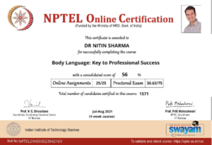 - Completed the 3 Month Short Term Course on “Body Language: Key to Professional Success” from NPTEL, funded by the Ministry of HRD, Govt. of India. Subject taught by Prof. Priti Maheshwari, IIT Roorkee. The course is delivered through SWAYAM.