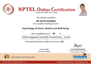 - Appeared and successfully completed the 3 Month Short Term Course on “Psychology of Stress, Health and Well-being” from NPTEL, funded by the Ministry of HRD, Govt. of India. The course was delivered through SWAYAM from January to April 2022.